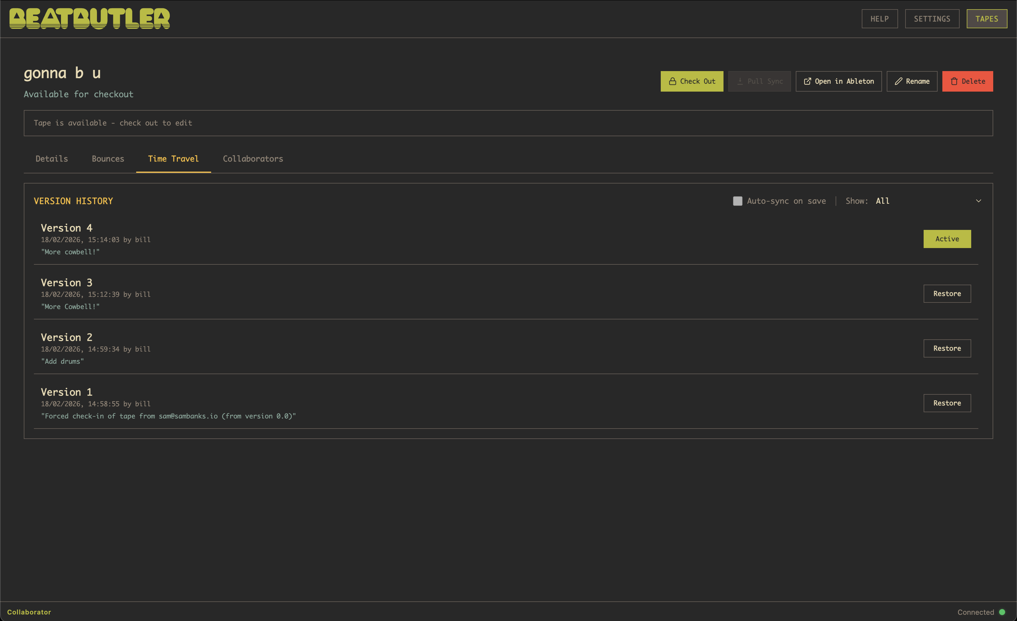 Restores are fast — BeatButler only downloads the files that are different between your current version and the one you're restoring. Nothing is ever deleted; restoring creates a new version from the old snapshot, so you can always go forward again.
